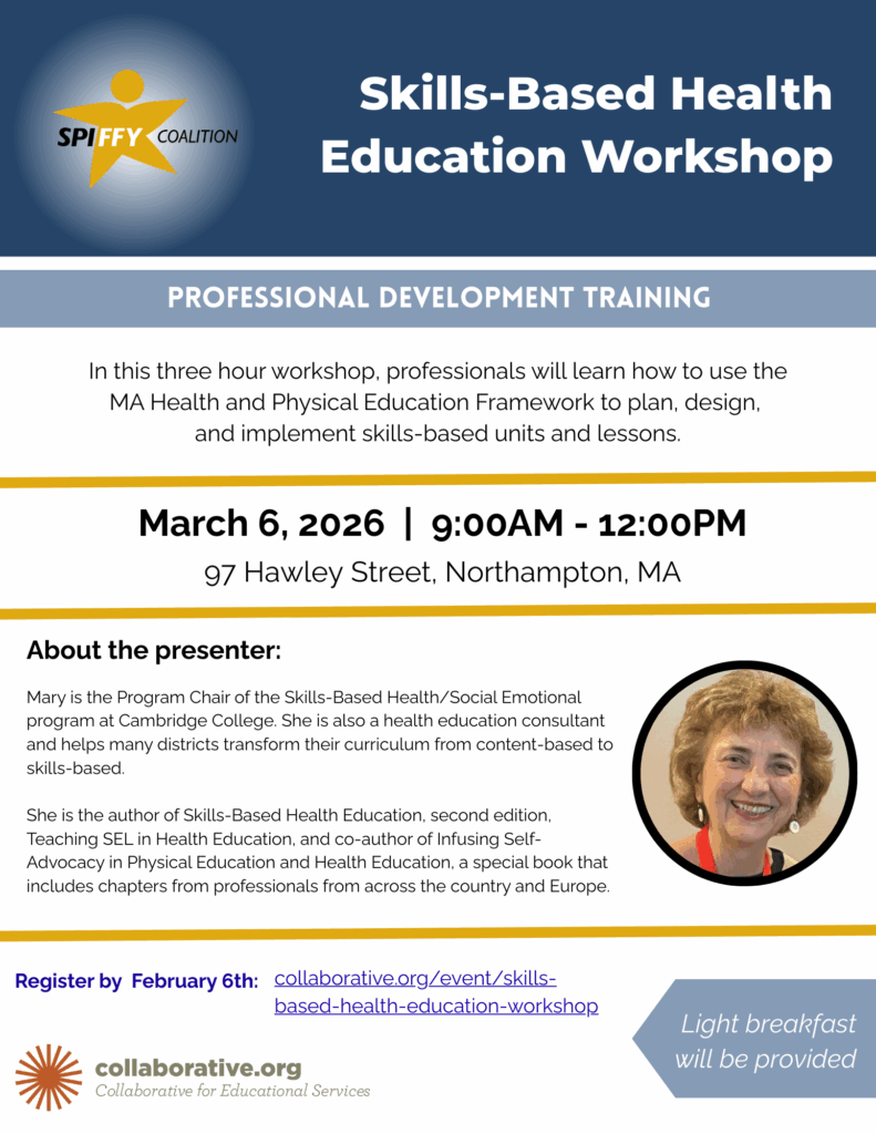 On March 6, 2026, from 9AM-12PM, Mary Connolly will be facilitating a “Skills-Based Health Education Workshop” at the Collaborative for Educational Services. In this three hour workshop, professionals will learn how to use the MA Health and Physical Education Framework to plan, design, and implement skills-based units and lessons. Light food and drink will also be provided.
