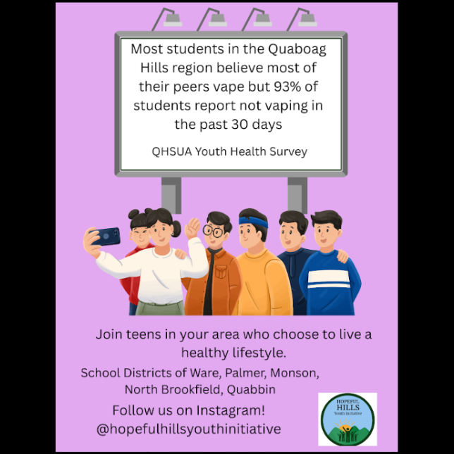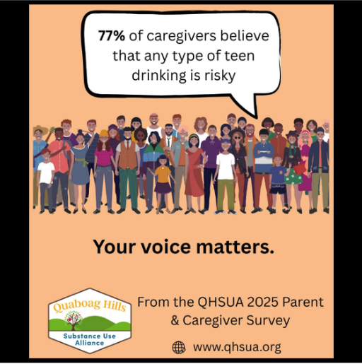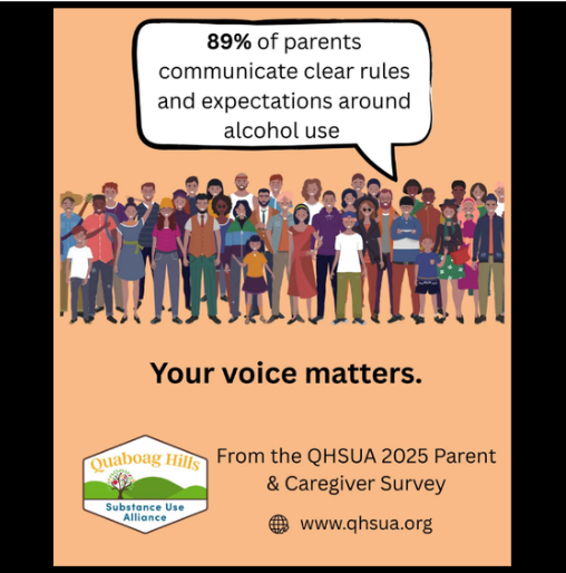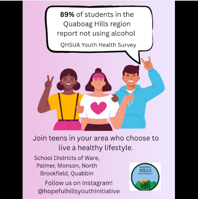 Quaboag Hills Substance Use Alliance has recently created two different social norms messaging campaigns with their youth advisory group. One campaign is targeted towards parents and caregivers in Ware, and one campaign is targeted towards youth in Ware. The data that informed these campaigns came from a QHSUA 2025 Parent and Caregiver Survey as well as the results from the 2025 Prevention Needs Assessment Survey of the school districts in Ware, Palmer, Monson, Quaboag Hills, and North Brookfield. The posters from these campaigns will be hung up in the schools of the towns listed above, and promoted through school take-home materials, libraries, lawn signs, and more!